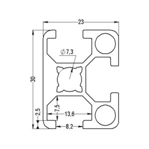 Mittayksikkö: m Weight/m: 0,622 Materiaali, väri: AL anodized silver 3D -tiedosto (step): 1.0004_23X30