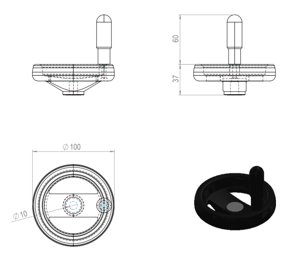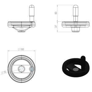Unit: kpl Material, color: Plastic black 3D-file (step): 2.9018_Käsipyörä_D100