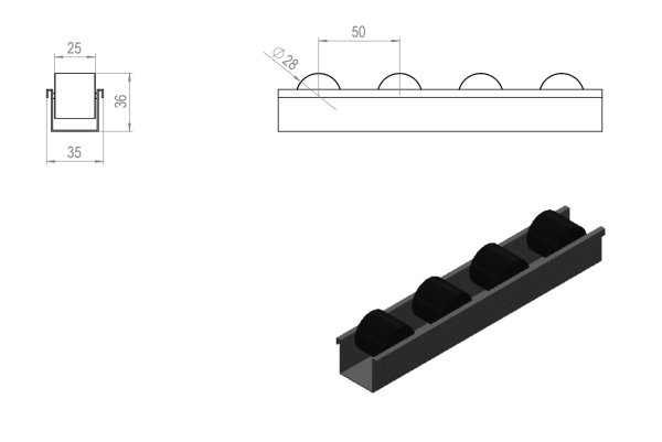 Mittayksikkö: kpl Materiaali, väri: Zinc plated steel 3D -tiedosto (step): 1.8054_Rullakisko_ESD