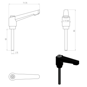 Yksikkö: kpl Materiaali, väri: AL musta 3D -tiedosto (step): 2.9011_Kiinnitysvipu_M6_AL_L50_ulkokierteellä