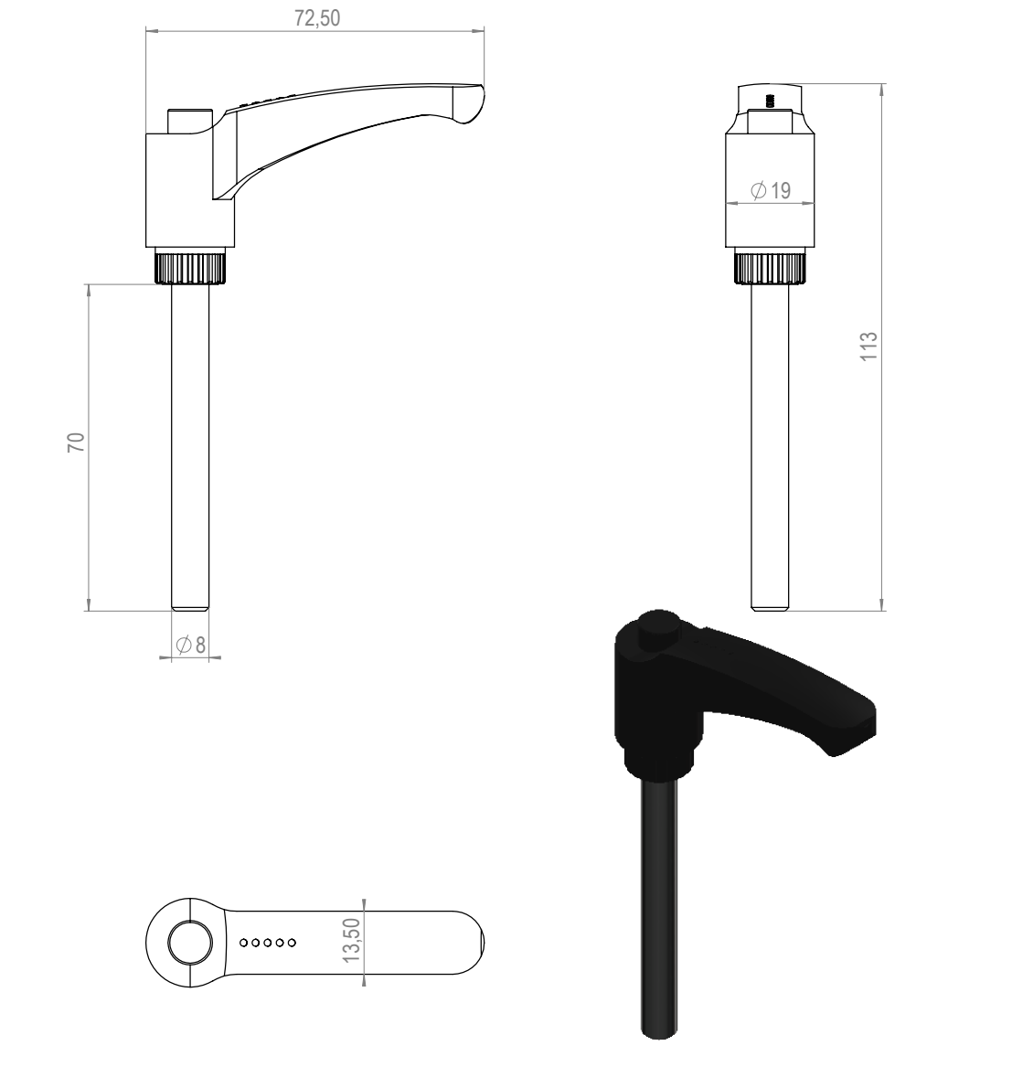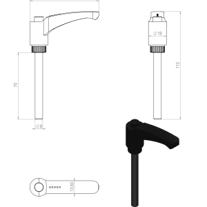 Yksikkö: kpl Materiaali, väri: Muovi musta 3D -tiedosto (step): 2.9015_Kiinnitysvipu_M8_L70_ulkokierteellä