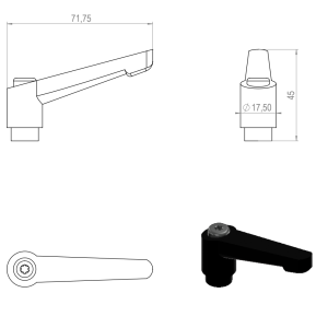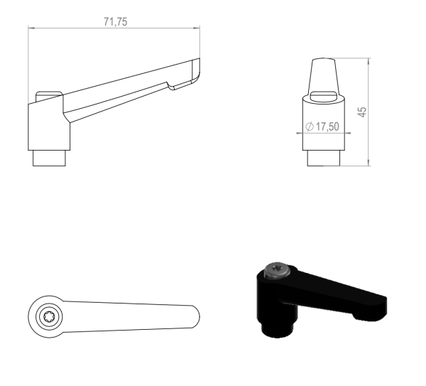 Yksikkö: kpl Materiaali, väri: AL musta 3D -tiedosto (step): 2.9009_Kiinnitysvipu_M8_AL_sisäkierteellä