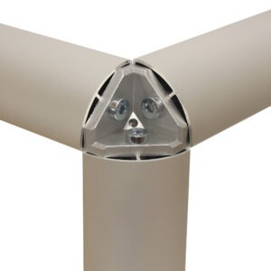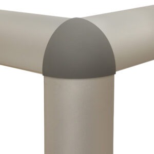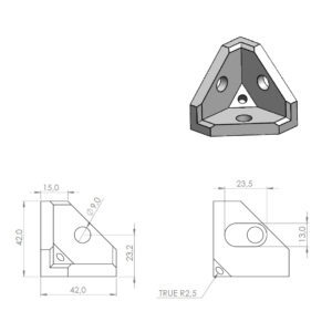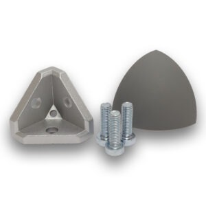 Kiinnityskulma 45 R 90 -profiilin nurkkaan. Mukaan tulee 3kpl M8x25 kuusiokoloruuvia sekä päätysuoja kulmalle.