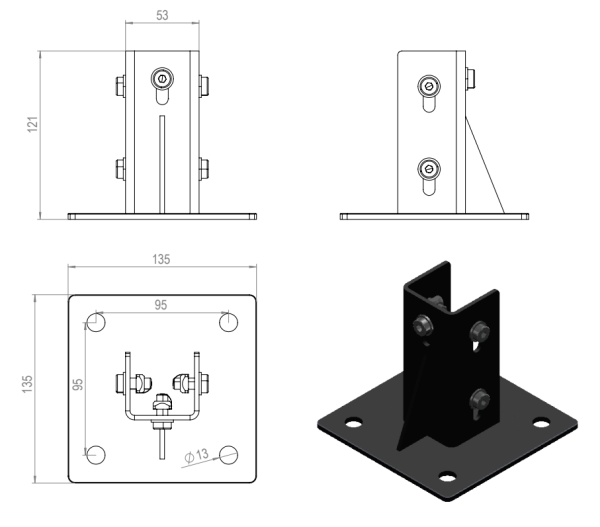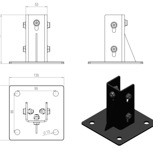 Lattiakiinnike 45 mm profiileille. Yksi sivu on avoin, joten kiinnitys onnistuu myös leveämpään profiiliin (esim. 45×90). Sisältää 5kpl Kuusiokoloruuvi M8X20, 5kpl Neliömutteri M8 kiinnityslevyllä ja 5kpl M8 aluslevy.